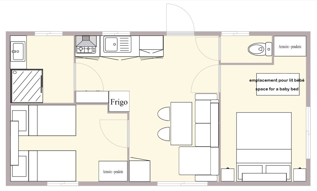 Peut convenir pour 3 personnes valides + 1 personne en fauteuil, ou 2 personnes en fauteuil et 1 personne valide (afin que les 2 chambres à coucher soient accessibles PMR nous retirons le 2eme lit de la chambre n° 2)